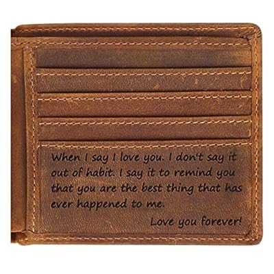 This genuine leather wallet comes with a personalized engraved message inside—a sweet surprise he'll discover every time he opens it. "To my husband" or "I love you" messages come pre-engraved.